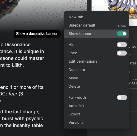 On a wiki page, click the three-dot menu and click "Show banner" to get started. This option won't show up on a map or board tab, as the banner is not displayed there due to space reasons.