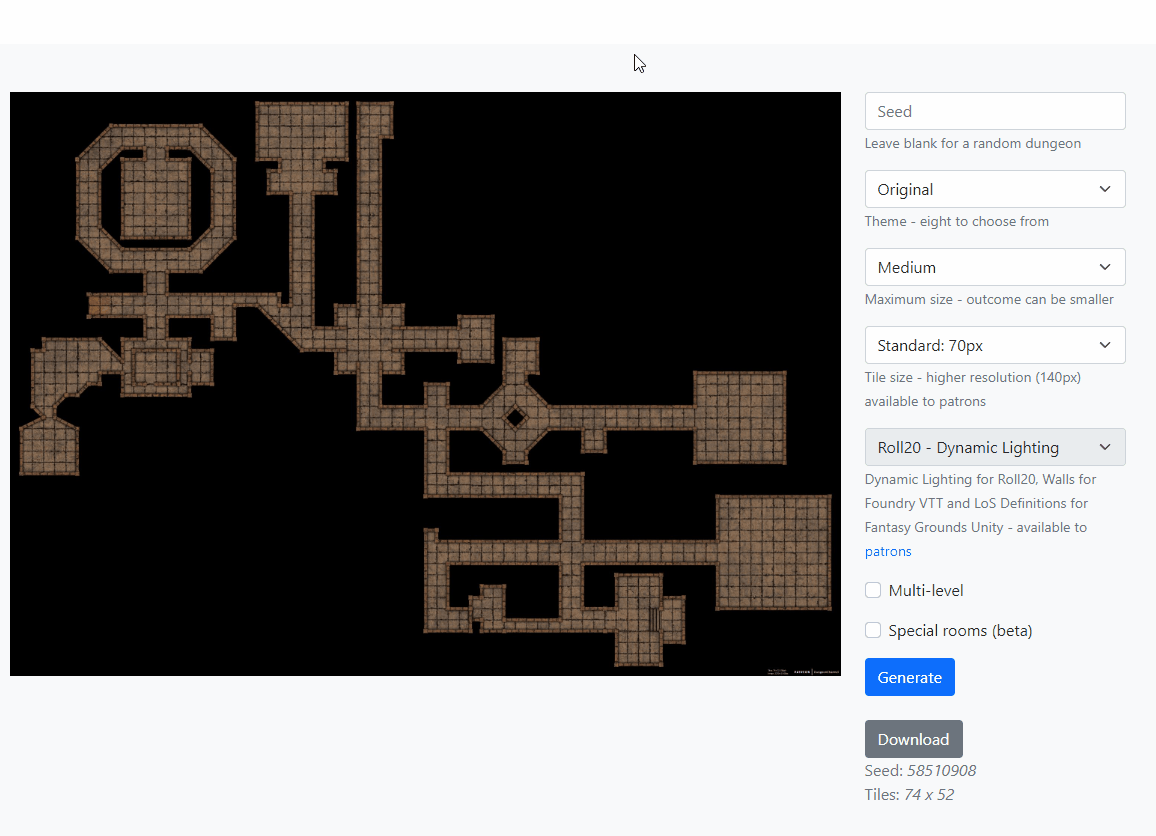 In addition to dungeon generation, DunGen.app can create cave maps. Supporters get an added functionality of Dynamic Lighting for Roll20, Walls for Foundry VTT, and LoS Definitions for Fantasy Grounds Unity.